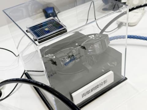 「網膜への直接投影のため、遠くのものを見ながらでも焦点のあった映像を投影できる」(説明員)ことから、ARに向いているとする。現在の試作機はのぞき込むタイプでメガネとの併用はあまり考慮されていないが、今後はメガネ状の試作品を検討していくという。