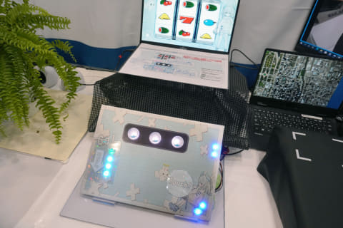 スロットマシンを模したデモンストレーションでは、物理ボタンを使わずにZINNSIAによるセンシングと振動によって、実際にボタンを押しているような感覚を体験できる。