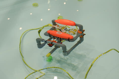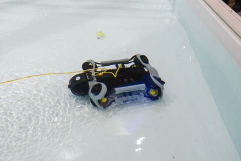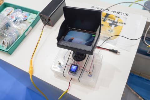 本格的なドローンのほか、長崎総合科学大学工学部の松岡和彦教授が開発した約3万円で作ることのできる水中ドローンも登場、水槽の中で操作してマグネットでカプセルを回収するという体験もできた。なお、製作費の3万円とは、海中で紛失や破損してしまってもあきらめがつく金額を漁業関係者からヒアリングしたもの。その3万円に収まるよう水道用の塩ビパイプをはじめ安価なパーツで構成した。