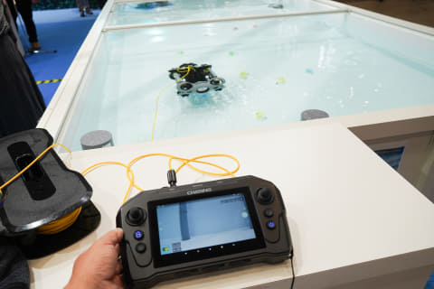 まず、目を引くのが巨大水槽。時間を決めてデモンストレーションを行っているが、人気は水中ドローンの体験。水中ドローンの「CHASING M2 S」を実際に操作でき、空飛ぶドローンと同様に前後左右への動き、浮上と潜水、左右の回転、機体のチルトなどを体験でき、同時にドローンからの映像をコントローラーに映して見ることができる。