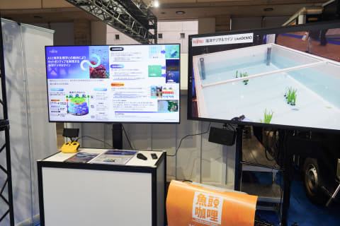 また、富士通は海中デジタルツインの展示。これは海洋におけるカーボンニュートラルを支援するため、水中ドローンを使って計測や収集した海洋データをもとに海の中の様子を3Dで再現する。