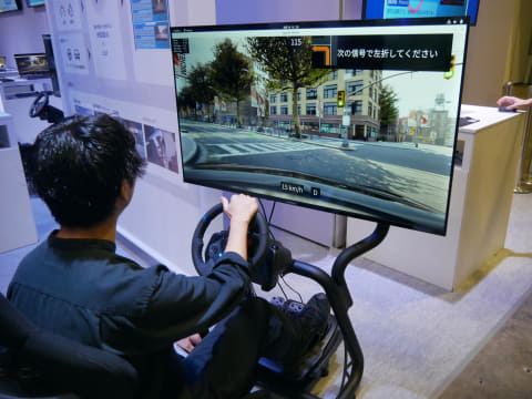 展示会場には、 NECが開発した映像認識AIと、大規模言語モデルを組み合わせたドライブシミュレーターを用意。運転データからドライバーの運転と走行状況を分析して、事故発生リスクなどを予測。運転方法の改善を提案する。ドライバーの運転の習慣変容を促し、事故率の削減や燃費の改善につなげるという。