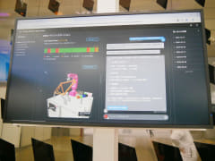 未来の工場における塗装ロボット生産ラインをブース内に再現。三菱電機の産業用ロボットから得られたデータを、AWS上で、リアルタイムで可視化。エッジAIと組み合わせることで、デジタル空間上での動作検証、トラブルシューティングなどが可能になる。