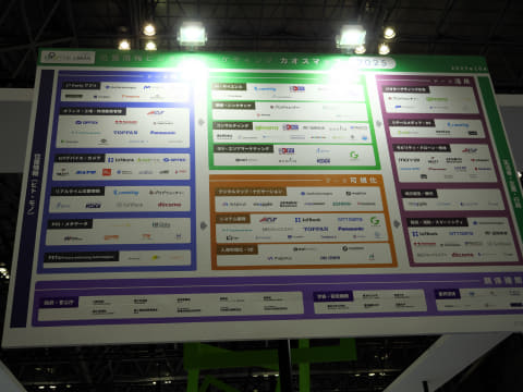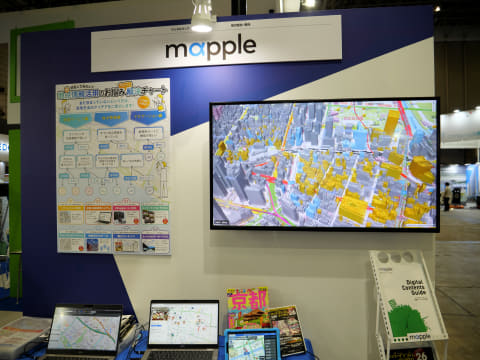 地図ソフト「スーパーマップル・デジタル」を提供する株式会社マップルのブースでは、地理空間情報に関する悩みにチャート式で活用方法のアイデアを紹介する「何をしてみたい? 地点情報活用のお悩み サクッ!と解決チャート」のポスターを掲示した。例えばオンラインの地図機能を必要としている場合で、手持ちのシステムに組み込みたい場合は同社の「ベクトルタイル地図」、業務用カーナビ機能が欲しい場合は「ルートナビゲータープラス」など最適な製品やサービスがわかる。
