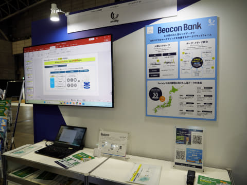 GPSおよびビーコンデータにより屋内外の行動を把握できる人流データ「Beacon Bank」を提供する株式会社unerryのブースでは、同社の人流データがスマートシティ施策に活用できることをアピールし、2025年度は30都道府県において観光分析や交通最適化、脱炭素、オーバーツーリズム解消など、自治体や不動産、公共交通事業者によるまちづくりの支援を行った実績を掲示した。
