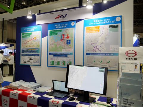 日野コンピューターシステム株式会社は、日野自動車製トラックやバスから収集した車両位置や燃費、急加減速、ADAS(先進運転支援システム)作動情報などのコネクティッドデータを活用したサービスとして、道路事業による物流効率化や交通流の変化を定量的に評価するサービスや、水素ステーションの立地予測、高速道路におけるリアルタイムな交通流の可視化などのサービスを紹介した。道路事業評価サービスでは、大型・中型・小型トラックや観光バス、冷凍庫、ダンプなど車種や架装ごとに分類して分析できる。