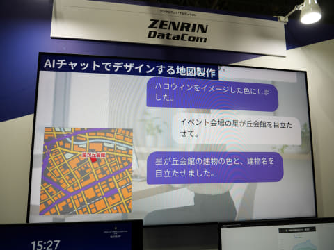 ゼンリンデータコムのブースでは、AIと対話することでオリジナル地図を簡単に作成できるサービスや、生成AIにより音声やテキストによる指示で地図の表示や検索、混雑情報などを調べられる「時空間マップAI」を展示した。AIとの対話により商圏分析や需要予測、防災計画の立案、イベント候補地などさまざまな分析を行える。