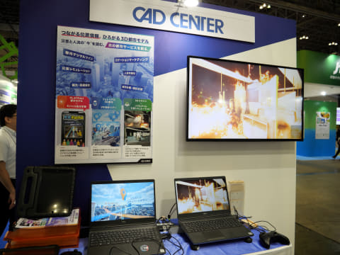 3DCG技術を活用した映像やVRコンテンツ、シミュレーションなどの制作を手がける株式会社キャドセンターのブースでは、CEATEC会場を3Dスキャンで撮影・モデル化し、地震や火災、水害などさまざまな災害シナリオを体験できるコンテンツを表示したほか、PLATEAUの3D都市モデルを活用して板橋区の街並みを再現した水害避難シミュレーションや、空中散歩の感覚で都市景観と物件を把握できるVR物件ツアーのコンテンツなども展示した。