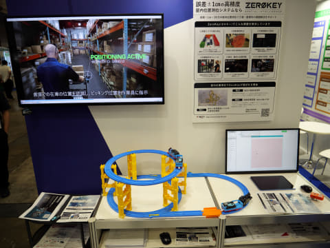 精度の高さを示すために、昨年は玩具のプラレールに測位デバイスを取り付けて走行させ、リアルタイムに軌跡を表示するデモンストレーションを行っていたが、今年はプラレールのレールを2層にして、高さも高精度に測位できることをアピールした。