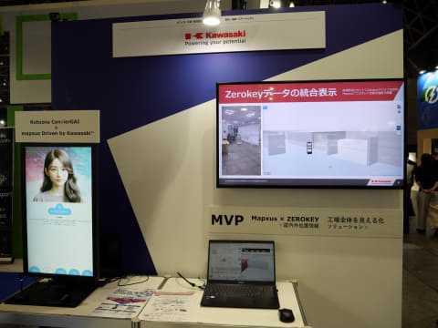 川崎重工業株式会社は同社が提供する屋内位置情報サービス「mapxus Driven by Kawasaki」を展示した。同サービスではネクスティエレクトロニクスのZerokeyとも連携し、Zerokeyデバイスの位置情報を統合表示することができる。これにより複数の屋内測位技術を使い分けることが可能となり、工場内を移動する人やロボットなどの位置の可視化が可能となる。