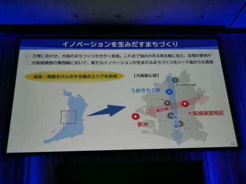 さらに、大阪城東部地区では、大阪公立大学を中心とした「知の拠点」を形成し、2028年には街開きを行い、Osaka Metroの新駅の開業、アリーナの整備、空飛ぶクルマや自動運転バスの拠点設置も予定しているという。