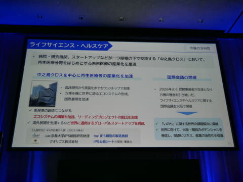 この領域におけるレガシーとしての継承では、大阪府が、病院や研究機関、スタートアップを集積する中之島クロスを設置。臨床から実装までをワンストップで支援し、再生医療などの産業化を加速する体制を構築していることを示し、「中之島クロスでは、万博期間中に、国際会議も開催しており、今後は、万博のレガシーとして、ライフサイエンス分野のダボス会議のようなものを、毎年、大阪で開催していきたい」と述べた。