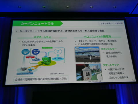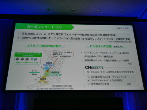 「カーボンニュートラル」では、CO2と水素から都市ガスの主原料であるメタンを生成するメタネーションを実現し、万博会場内の迎賓館の厨房と熱供給設備に供給したこと、薄くて、軽くて、曲がるといった特徴を持つペロブスカイト太陽電池を、バスシェルターの屋根に設置して、会場内の夜間電力に使用したり、衣服に取り付けた同電池で発電して、冷却ファンを回したりした事例を紹介。すでに、官民連携によって、e-メタンなどの次世代エネルギーの拠点形成に向けた取り組みを推進していること、2027年度にペロブスカイト太陽電池の量産化拠点を、堺の港湾地区で稼働する予定であることを示したのに加え、民間からの寄付で設立したイノベーション創出基金を活用して、スタートアップ企業などを支援することにも触れた。