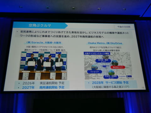 「新モビリティ」では、大阪・関西万博の期間中に、空飛ぶクルマのデモフライトを行ったことを報告。「空飛ぶクルマは、空の移動革命になる」とした上で、大阪府と大阪市が、JALグループのSoracleと連携することを発表しており、2026年に実証運航を開始し、2027年に商用運航を開始する予定であること、Osaka MetroとSky Driveとの連携では、2028年に大阪城に隣接する森之宮エリアで、空から観光を楽しむサービスを開始する予定であることを示した。