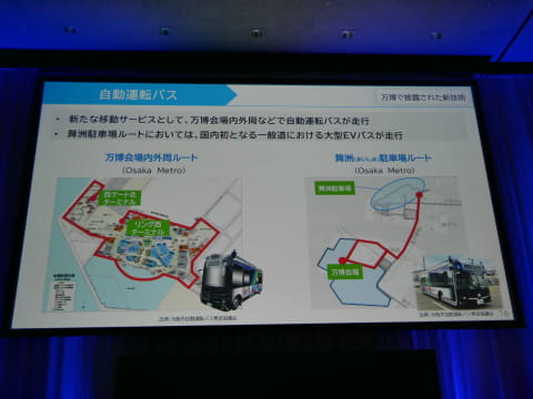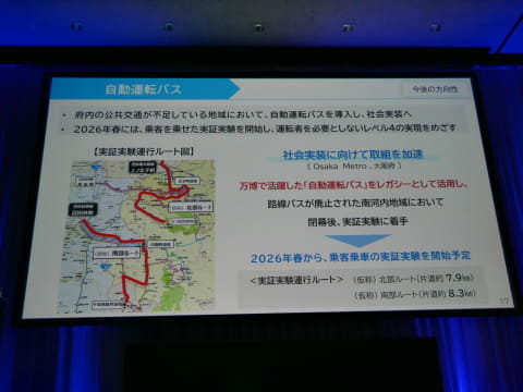 また、自動運転バスについては、万博会場内での走行と、舞洲の駐車場までの一般道路の走行を行ったことを報告し、「大型EVバスが、一般道路を自動運転で走行したのは日本で初めてのことであった」と述べた。公共交通が不足している地域(南河内地域)において、自動運転バスを導入する計画であり、2026年春には、乗客を乗せた実証実験を開始し、運転手を必要としないレベル4での実用化を図るという。