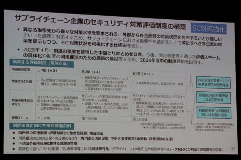 そこで、政策の柱の1つである「サプライチェーン全体での対策強化」の一環として挙げたのが、「サプライチェーン企業のセキュリティ対策評価制度」だ。現在、サプライヤー側の企業にとっては、発注元の企業によって異なる水準のセキュリティ対策を要求される一方、発注元の企業からすると、発注先のサプライヤーがどの程度のセキュリティ対策をとっているか判断しづらいという“すれ違い”があるという。この制度はそうした課題に対応するためのもので、サプライチェーン内の企業が満たすべきセキュリティ対策について国で統一的なレベルを提示し、評価結果を星の数により“見える化”するのが目的。2026年度中に制度開始を目指している。