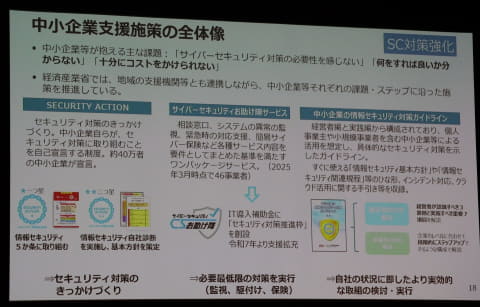 今回の講演では、国内で発生した主なサイバー攻撃として、2024年5月、DMM Bitcoinから約482億円相当の暗号資産が、取引管理業務の委託先企業を経由して盗まれた事案などを例示。また、IPAが毎年発表している「情報セキュリティ10大脅威」の2025年版において、2位に「サプライチェーンや委託先を狙った攻撃」がランクインしていることを紹介。サプライチェーンや委託先を起点とした情報漏えいや資産の窃取事案が深刻になっていることを示し、サプライチェーンや委託先において相対的にセキュリティ対策の弱い中小企業のセキュリティ対策を強化することの必要性を強調した。