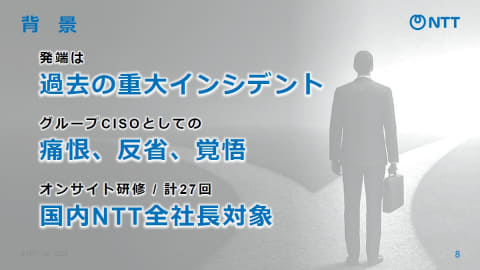 原因は「内部不正」で、技術的対策だけでは解決は困難。人事、社風、カルチャー、社内コミュニケーションなど複合的な要素が絡むため、各社の実情に合わせた対策が必要となる。そこで、これをグループ会社の社長に考えてもらうための研修を企画したという。国内のNTTグループの全社長が対象だ。