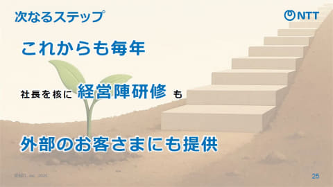 一方、NTTグループ各社の社長はほぼ5年で入れ替わる。このため、これからも毎年、社長研修を行う予定を示した。参加した社長から経営陣研修も含めたいというフィードバックもあったほか、外部の顧客にもこのプログラムを提供する予定だと説明して講演を終了した。