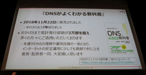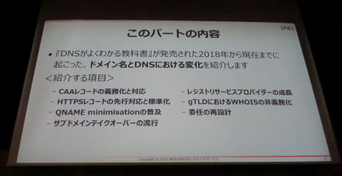 今回の内容は「DNSの変化」をテーマとし、『DNSがよくわかる教科書』[*1]が発売された2018年から現在までの間にドメイン名とDNSに起こった主な変化と、それを踏まえたDNSと『DNSがよくわかる教科書』のこれからが、話の中心になっている。講演の後半は書籍に関する話題が多かったことから、本レポートでは前半の「ドメイン名とDNSにおける最近の変化」に重点を置いて解説する。