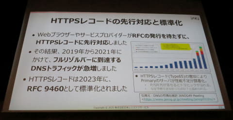 図5は、WebブラウザーやサービスプロバイダーがRFCの発行を待たずに、HTTPS RRに先行対応したことで、フルサービスリゾルバー(キャッシュDNSサーバー)に到達するクエリ数が急増したことを説明したものである。