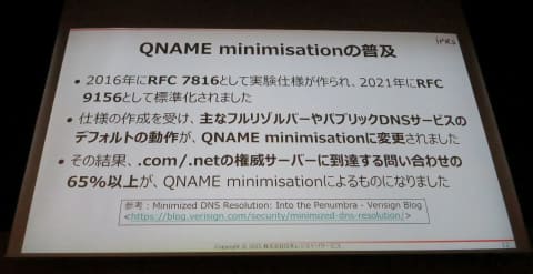 「QNAME minimisation」は、フルサービスリゾルバーが権威DNSサーバー群に問い合わせる際の問い合わせ名を最小化し、利用者のプライバシーを保護する仕様である。図6はQNAME minimisationの普及状況について説明したものだが、.com/.netの権威DNSサーバーに到達する問い合わせの65%以上がQNAME minimisationによるものだというのは、かなり高い比率である。