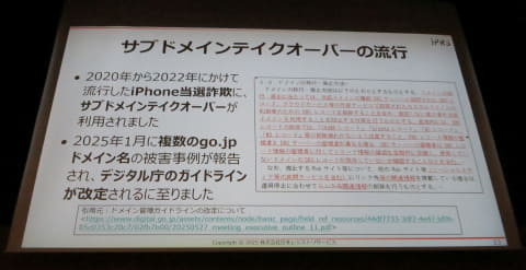 「サブドメインテイクオーバー」とは、外部サービスの利用開始時に設定したCNAME RRやA/AAAA RRが利用終了後も削除されずに残っていることに付け込み、その設定を利用してそのサブドメインの利用を引き継いで(テイクオーバーして)しまおうというものである。図7は、サブドメインテイクオーバーの流行と、2025年1月に報告された複数のgo.jpドメイン名の被害事例により、デジタル庁のガイドラインが改定されるに至ったことを伝えている。