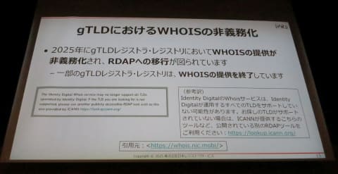 図9は、2025年1月28日以降、gTLDレジストリ/レジストラにおけるWHOISの提供が契約上の義務でなくなり(非義務化)、RDAP(Registration Data Access Protocol)への移行が図られていることを説明したものだ。