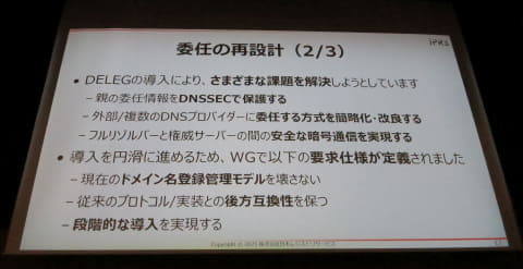 委任という仕組みはDNSの根幹を担う基本部分の1つであり、ドメイン名を登録する際の登録情報の取り扱いやレジストリ/レジストラモデルは、委任の仕組みを前提として設計されたものである。そのため、インターネットの安定運用の観点から、その変更には慎重な検討と適切な導入計画が必要になり、ある程度の時間を要することはやむを得ない。Huston氏の指摘は、現在のdeleg WG、ひいてはIETFの活動そのものがプロトコルの「作成」「改良」という手段に終始し、現実の課題を解決するという本来の目的がおろそかになっているのではないかという問題提起であり、広く普及したプロトコルの改良と標準化作業は難しいものなのだと痛感せざるを得ない。