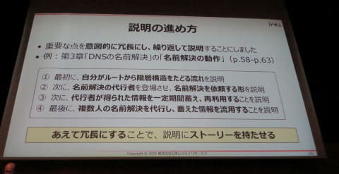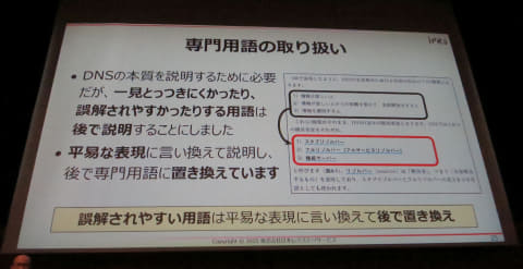 しかし、DNSには一見とっつきにくかったり誤解されやすかったりする、独特の用語・表現が存在する。そうした用語――例えば、特に誤解されやすい「再帰的問い合わせ」「非再帰的問い合わせ」は「私の代わりに名前解決をして、」が付いているかいないかの違いとして説明され、後で専門用語に置き換えるというかたちになっており、誤解を防ぐための工夫がされていると感じる。