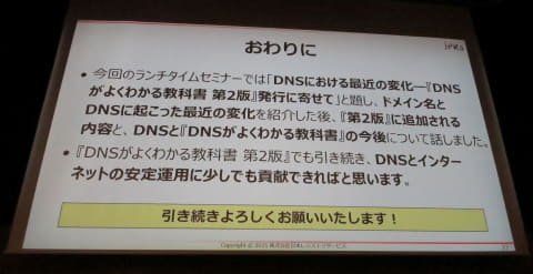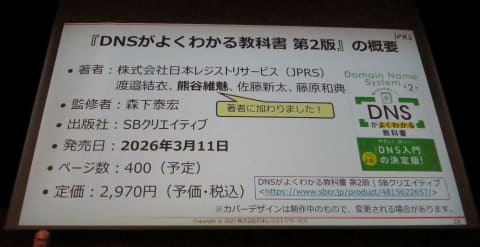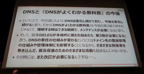 『DNSがよくわかる教科書』は名著だと思うが、監修者としての森下氏が今後どのようにかかわっていくのか、かかわれるのかがとても気になってしまった。無責任かもしれないが、契約社員や外部委託という手もあると思うので、健康に気を付けながらできるだけ頑張っていただきたいと切に願う。