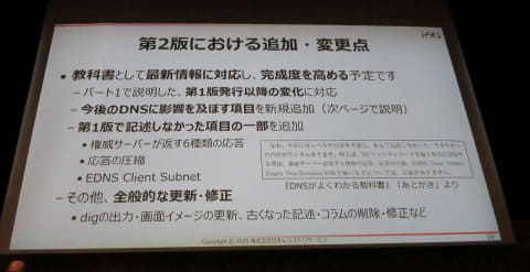次のパートである「『DNSがよくわかる教科書 第2版』の概要」では、森下氏から、現在の『DNSがよくわかる教科書』を振り返り、前のパートで説明したDNSの変化を踏まえ、現在制作を進めている『DNSがよくわかる教科書 第2版』がどうなる予定であるかの概要が紹介された。書籍を作っていく過程の話はとても興味深いが、レポートとしては簡潔に、筆者が頷いた部分と第2版の概要について紹介する(図13、図14)。