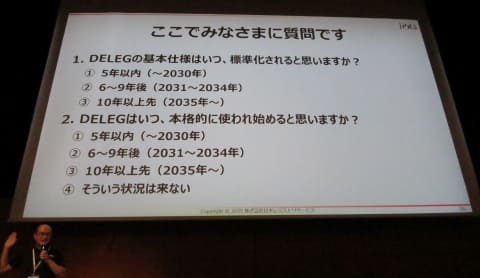 森下氏は冒頭のあいさつで、「JPRSを定年退職し、JPRSに入社しました」と述べており、定年後の再雇用であれば、雇用期間は5年程度と考えるのが妥当であろう。図19での質問に対する会場からの反応の多くは、基本仕様の標準化は2番の6~9年後、DELEGが本格的に使われ始めるのは3番の10年以上先というものであった。