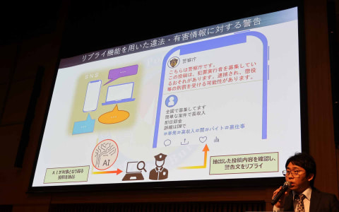 より身近なところでは、SNSの有害投稿をAIで発見・抽出し、該当する投稿に直接、警察庁名義でリプライするという取り組みを実施している。