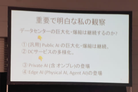 2つめは「集中と分散の振り子」。これまでインフラやサービスでは、集中型と分散型の流れが行き来してきた。現在のAIサービスはメガスケーラーへの集中型となっているが、「2025~2026年は、分散へ振り子が振れた年になると思う」と江崎氏は言う。そして「データセンターの巨大化・爆縮は継続するか」という問題については、汎用のパブリックAIは引き続き巨大化する一方で、プライベートAIやエッジAIなどデータセンターサービスが多様化するだろうと語った。