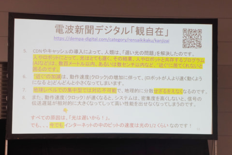 3つめは「APN(All-Photonics Network)では遅延は小さくならない」。つまり、「光は遅い」という指摘だ。世界規模に通信路が広がるとき、光による通信でも速度の限界がある一方で、応答速度に対するユーザーの要求がどんどん厳しくなり、ロボットなど応答速度が重要な用途もある。「必然的に、集中だけでは対応できないことになる」として、地理的な分散が求められると江崎氏は述べた。