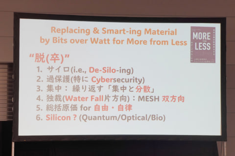 続いて、ワット・ビット連携構想に関連して、国際紛争による原油危機などを背景に、エネルギー安全保障のための脱炭素の必要性を江崎氏は説明し、「卒業したい6つ」として「サイロ化」「過保護」「集中」「独裁(ウォーターフォール)」「総括原価」「シリコン」を挙げた。