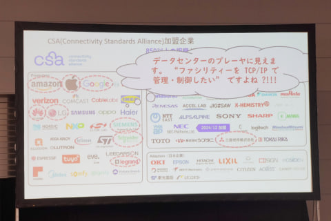 さらにCSA(Connectivity Standards Alliance)によるスマートホーム規格のMatterに触れ、家電だけでなくデータセンター関連の企業が参加していることを指摘し、ファシリティをTCP/IPで管理し、制御しようとしていると語った。かつてクラウド事業者などがホワイトボックスのサーバーを大量に採用したように、サーバー以外の設備系なども同じモデルに向かうかもしれないという。
