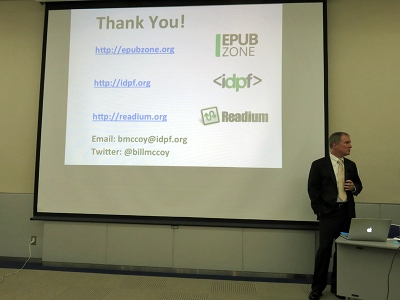 電子出版の国際標準フォーマット「EPUB」を推進する国際団体であるInternational Digital Publishing Forum(IDPF)が7月2日、東京ビッグサイトで行われた「第22回東京国際ブックフェア」の会場内で、セミナー「EPUB NOW AND FUTURE」を開催した。講師はIDPFエグゼクティブディレクターでReadium Foundation代表のBill McCoy氏。