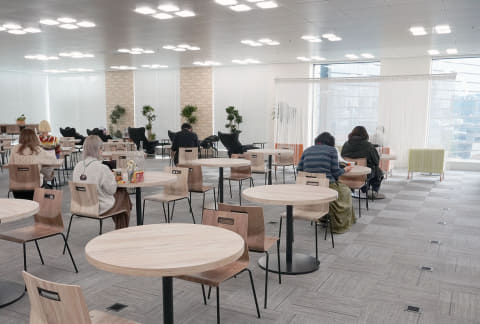 ビル内には広い休憩室も設けられており、休憩時間にはそちらも利用される。複数のマッサージチェアが並ぶエリアや、畳敷きのエリアもあり、オプテージの本社ビルは大阪城の近くにあるため、大阪城を眺めながらリラックスできる。