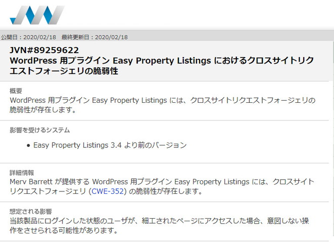 WordPress用プラグイン「Easy Property Listings」に脆弱性が存在するとして、一般社団法人JPCERTコーディネーションセンター(JPCERT/CC)および独立行政法人情報処理推進機構(IPA)が脆弱性対策情報ポータルサイト「JVN(Japan Vulnerability Notes)」で情報を公開した。