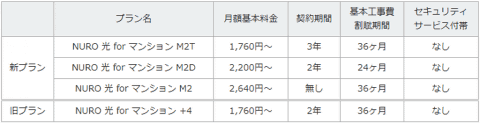 このほか、マンション向けのプランでは3年の継続契約で月額基本料金が1760円の「NURO 光 for マンション M2T」などを新設。既存プラン「NURO 光 for マンション +4」の新規申し込みは受付終了となる。