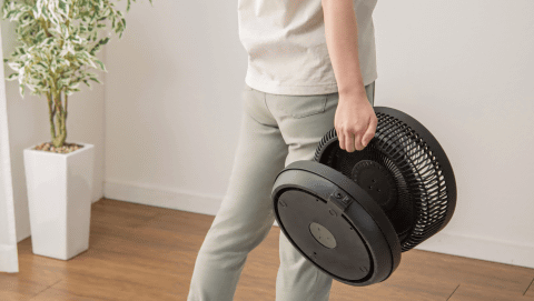 2025年モデルでは、本体裏面に持ち手となる窪みを追加し、持ち運びやすくなった。また、前ガードと羽根が取り外し可能となり、掃除がしやすいとしている。