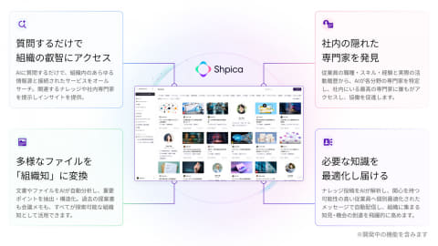 社内の文書やウェブページなどからナレッジを集約し、AIチャットボットを作成できるサービスが複数登場しているが、「Shpica」は、ナレッジの集約やAIを介したやりとりだけでなく、組織の人と人とのナレッジのやりとりやコミュニケーションも、AIがサポートし促進できることが特徴。