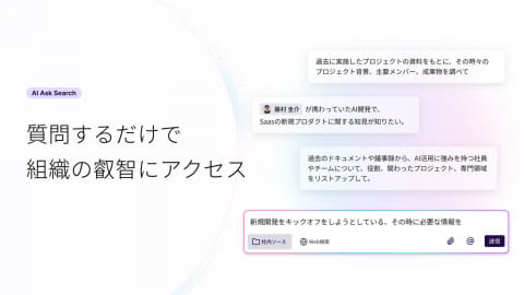 自然言語での質問に対し、AIがテキストや画像、PDFといった組織内のさまざまな情報源を横断的に検索し、関連するナレッジと社内の専門家に関する情報を回答する。