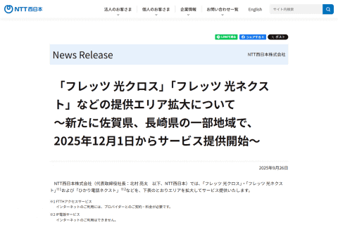 NTT西日本、「フレッツ光」提供エリアを佐賀県・長崎県の一部地域で拡大。最大10Gbpsの「フレッツ 光クロス」も提供