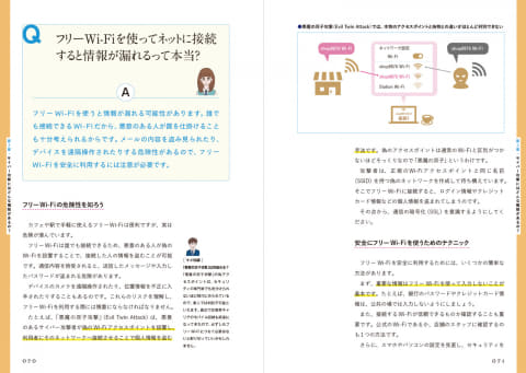 「そもそもサイバー攻撃ってなに?」「スマホを紛失したらどうなる? どうする?」「フリーWi-Fiは危険? 自宅Wi-Fiなら大丈夫?」といった、身近に潜むセキュリティの疑問について、図解とともにイメージしやすく答えている。技術部分の細かい説明は極力控え、「これだけは押さえておきたい!」という概念や重要キーワードに絞ることで、ITの知識がなくても、サイバーセキュリティの全体像を学べる内容になっている。