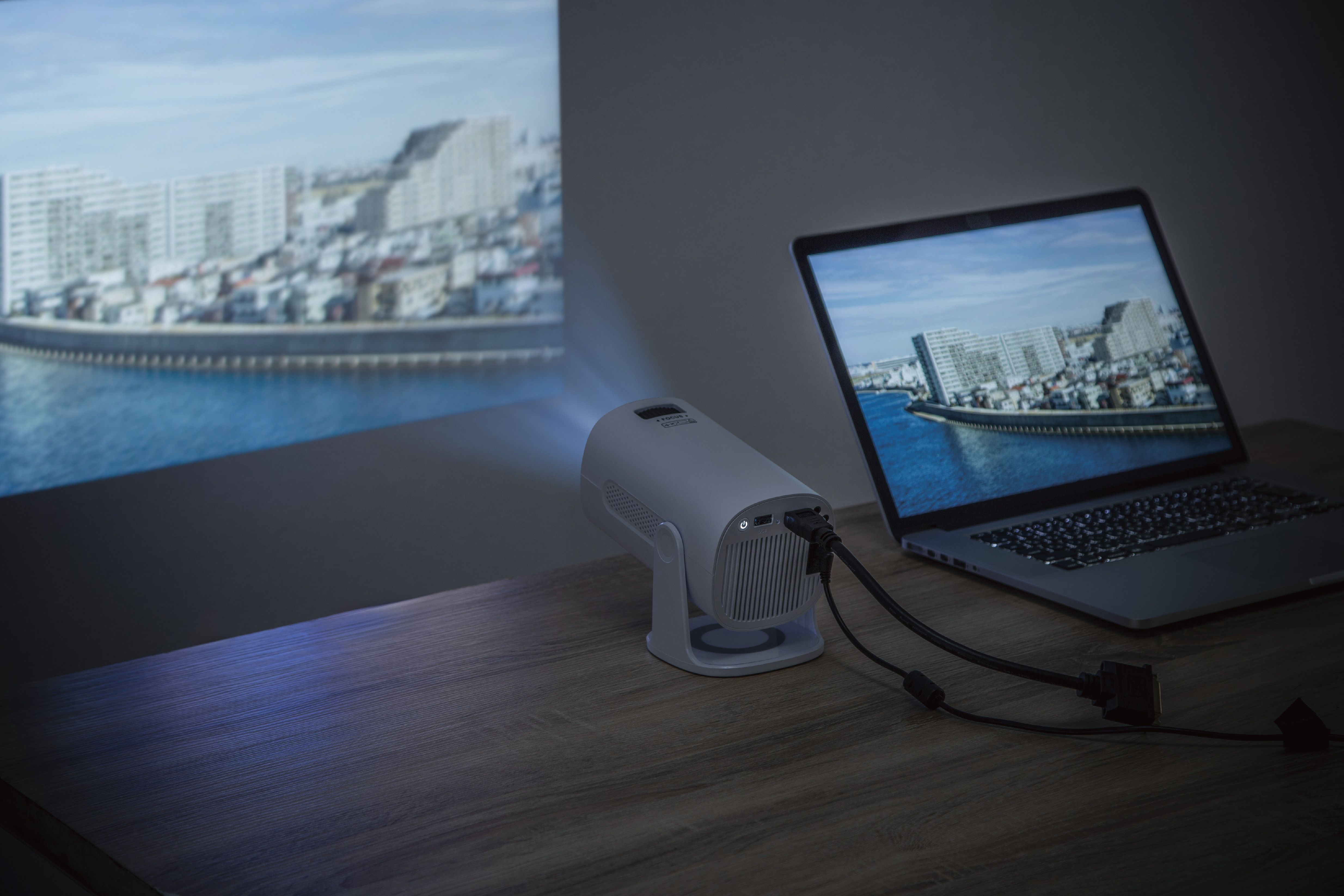 HDMI接続でスマートフォンやTVスティック、ゲーム機、PCなどの映像を投影可能。最大解像度は1280×720ドット/60fpsで、明るさ110ANSI lmで最大120インチの投影に対応している。本体背面にあるUSBポートを使用して、USBメモリやHDDに保存したコンテンツの再生もできる。