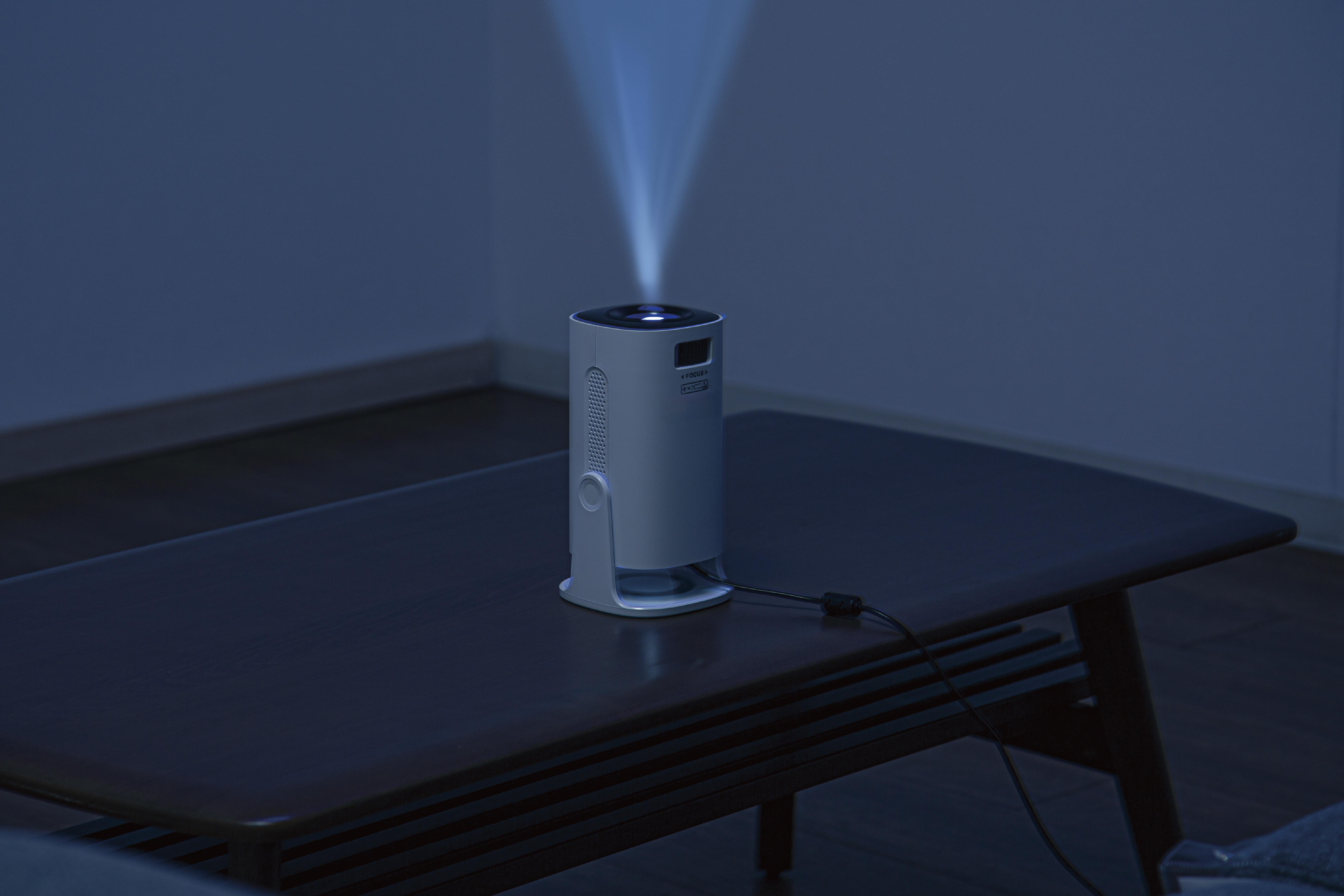 スタンドが本体と一体化しているため複雑な設置作業は不要で、見たい場所に置いてすぐに投影でき、簡単に角度調整も可能で、壁や天井など状況に合わせた投影が可能だとしている。