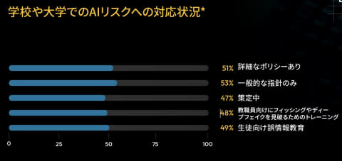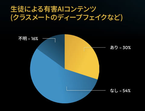 また、約30%の学校では生徒によるディープフェイク作成など有害なAIコンテンツの発生が報告された。